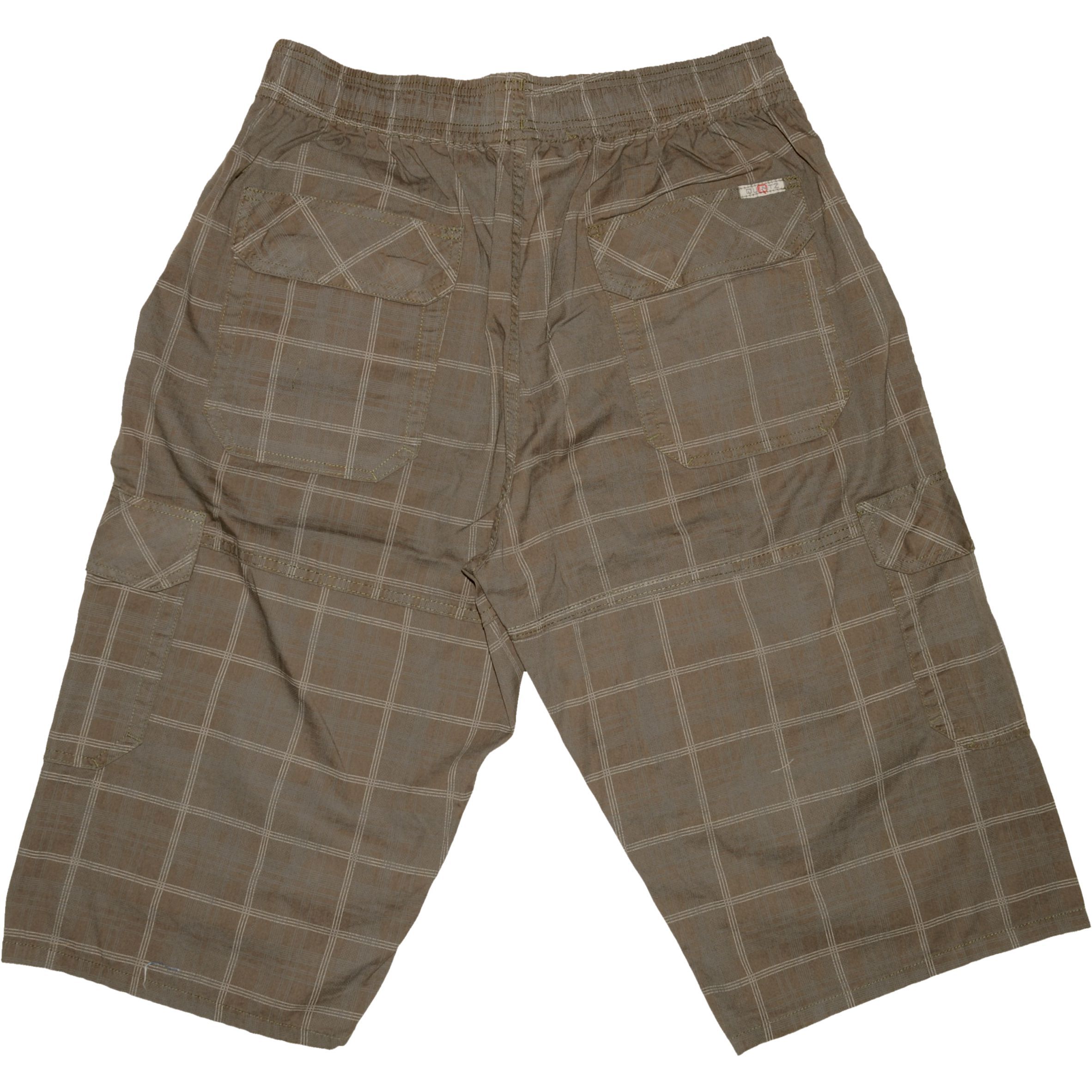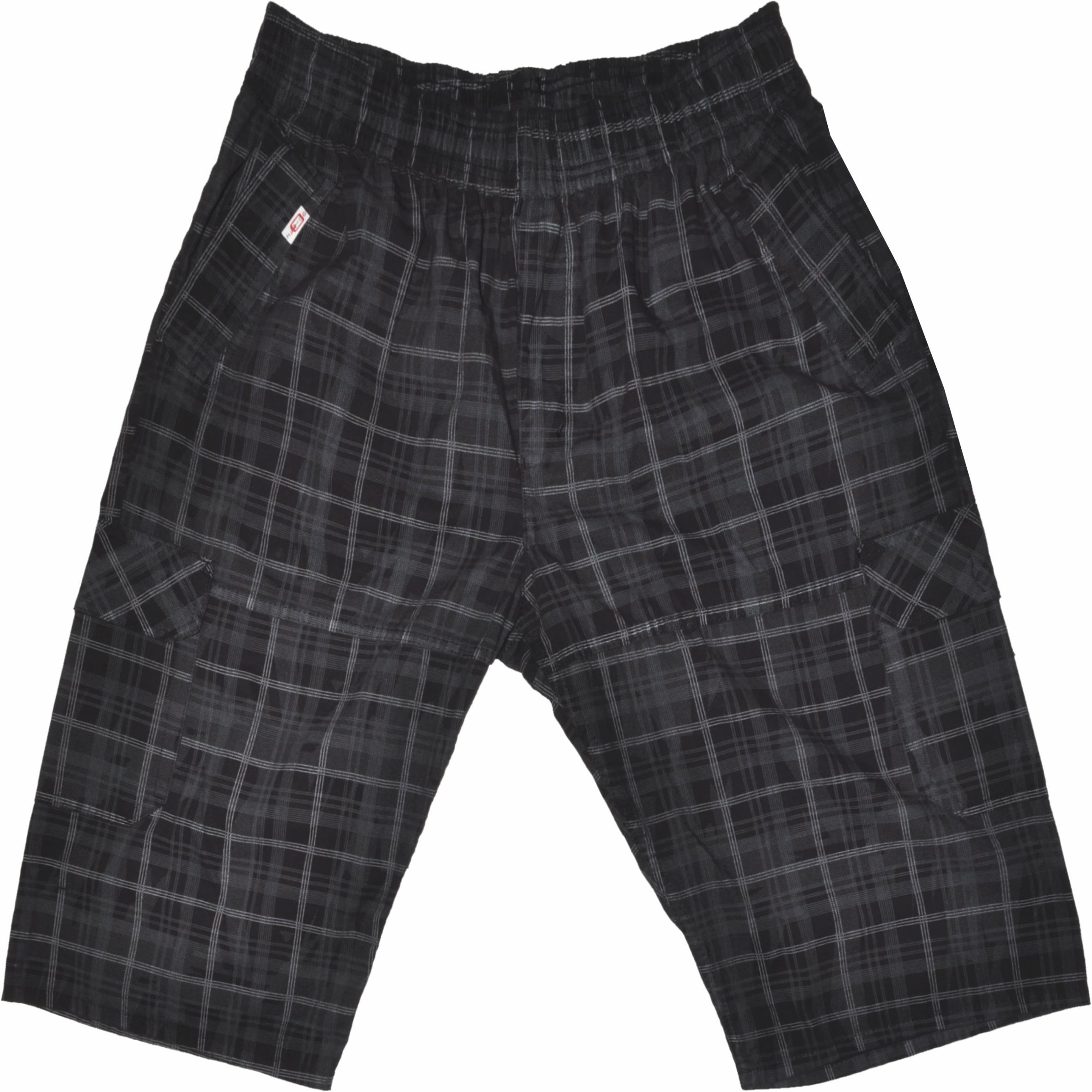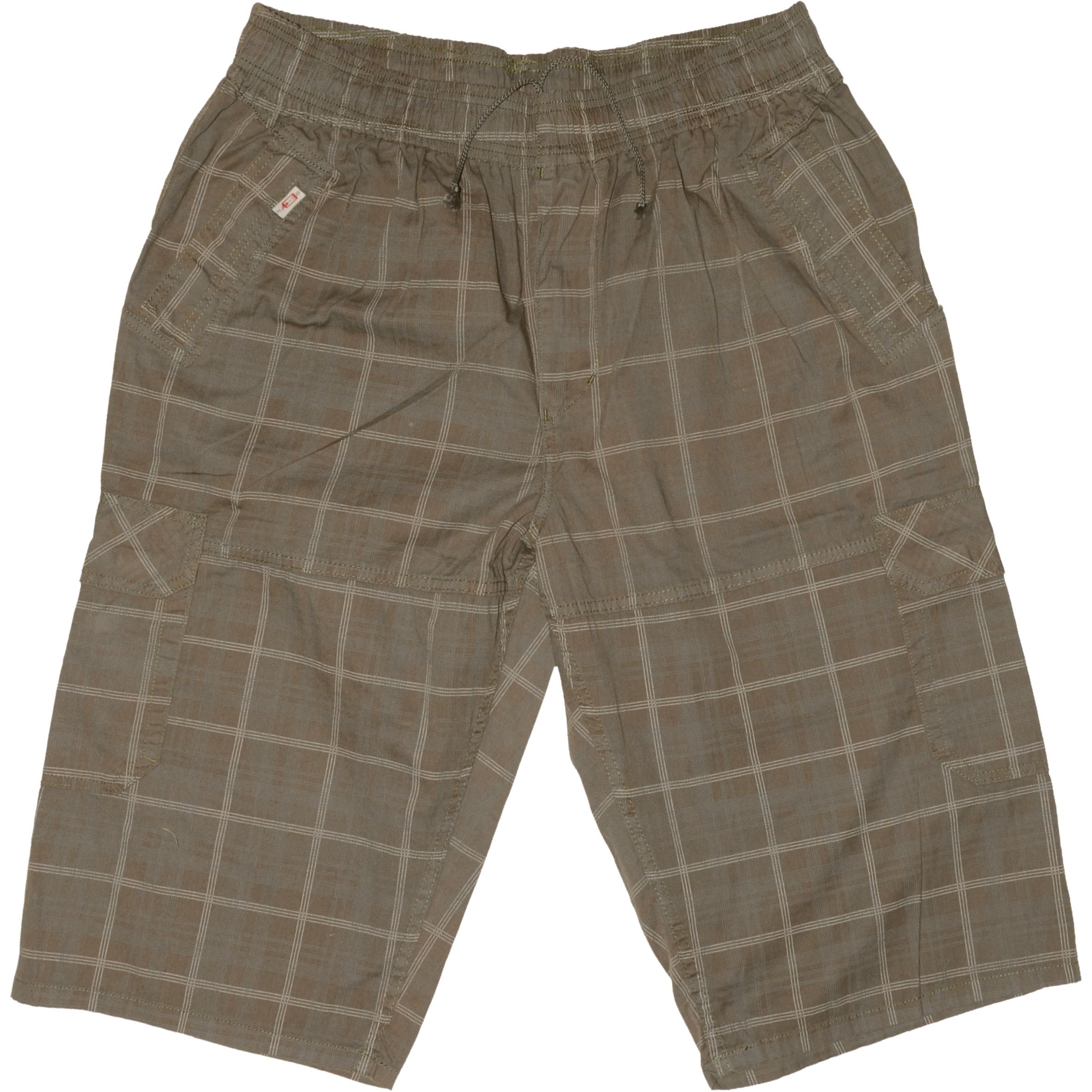 Gumírozott, kötős derekú, bővített fazonú, tiszta pamut alapanyagból készült, extra méretű férfi oldalzsebes rövidnadrág.