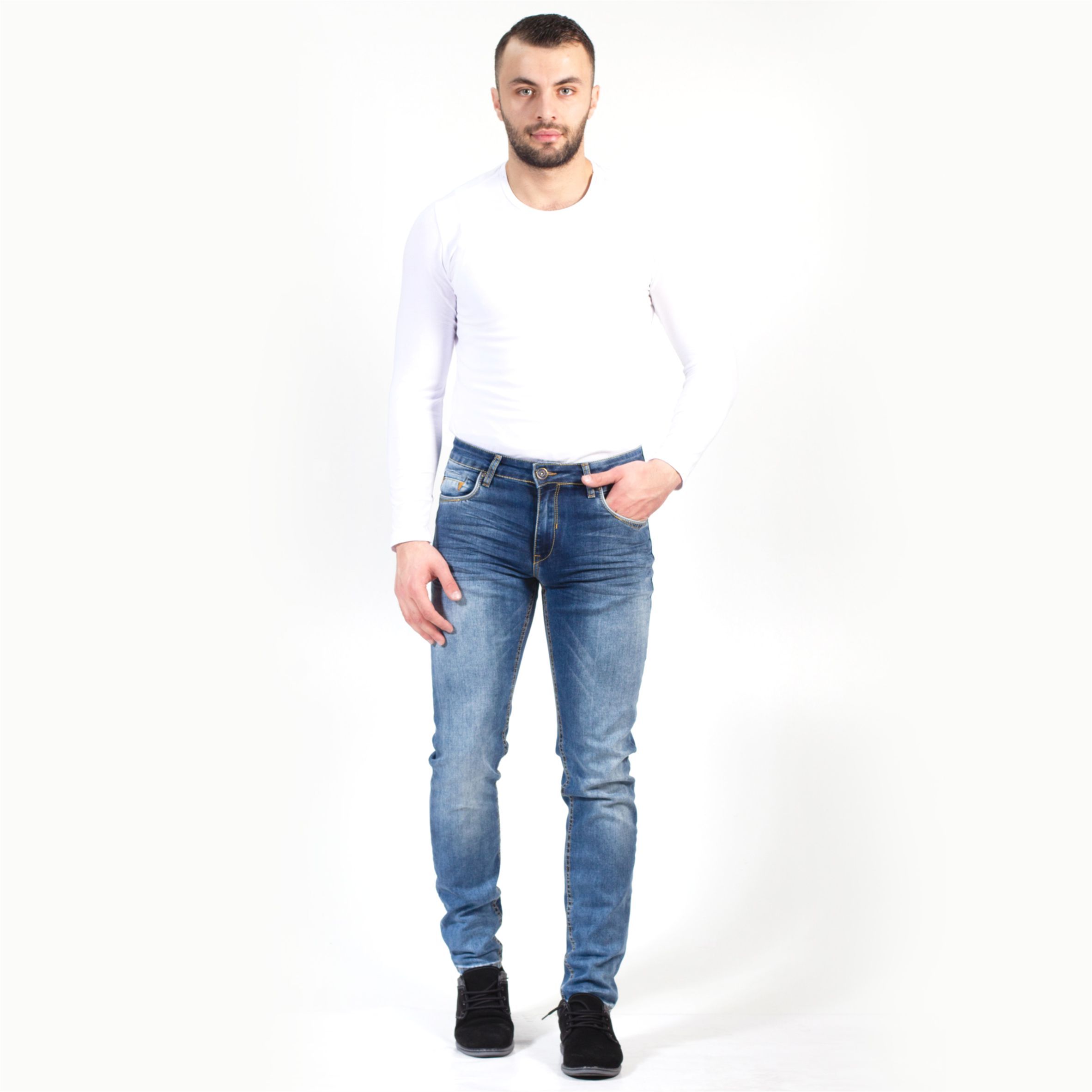 Aprólékos kidolgozottságú, prémium minőségű, rugalmas alapanyagból készült, szűk szárú férfi farmernadrág.