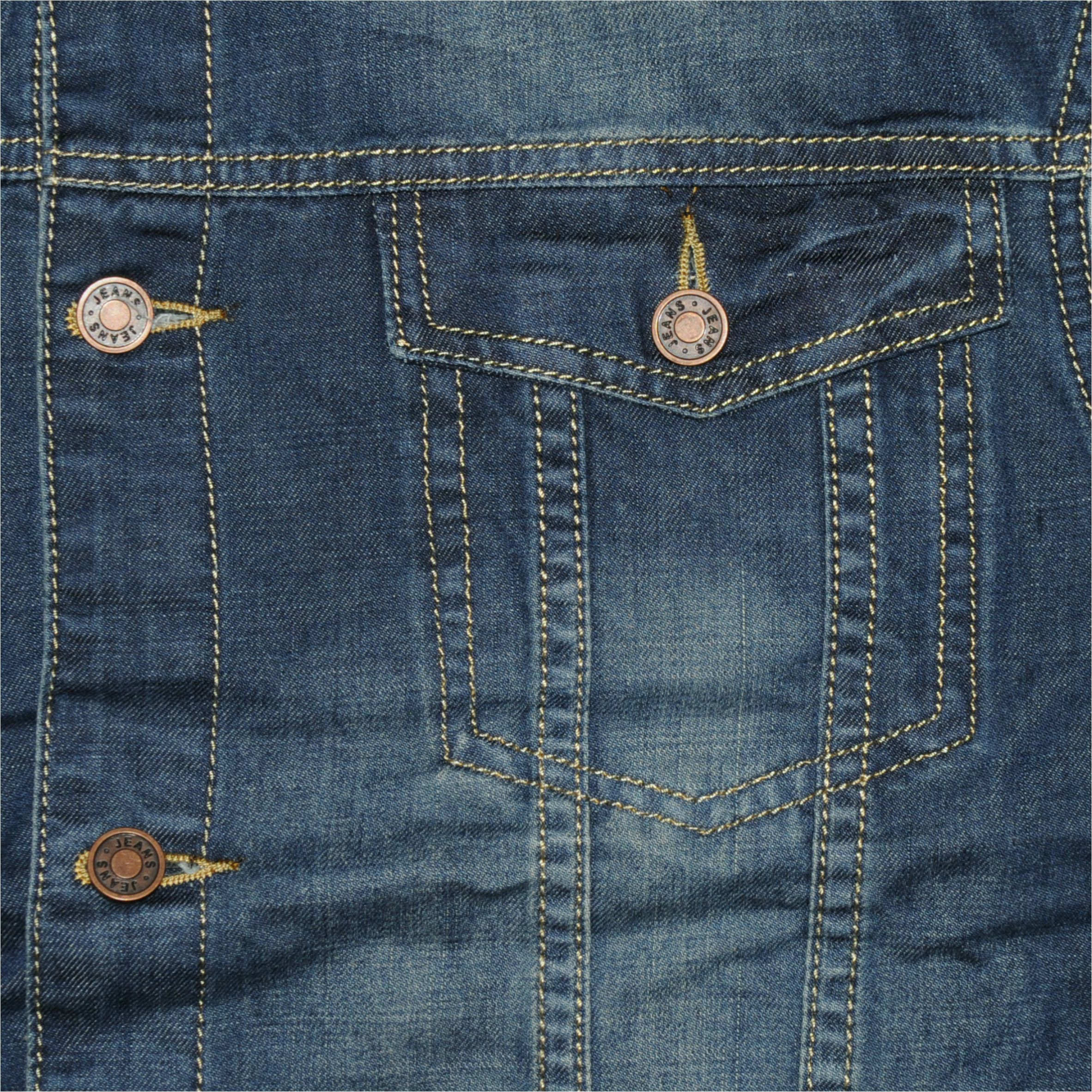 Csak ami kötelező: masszív, sprőd tapintású alapanyag enyhe koptatásokkal, hagyományos denim árnyalat, rézszínű gombok, drappos-narancssárga tűzések, hosszított fazon.