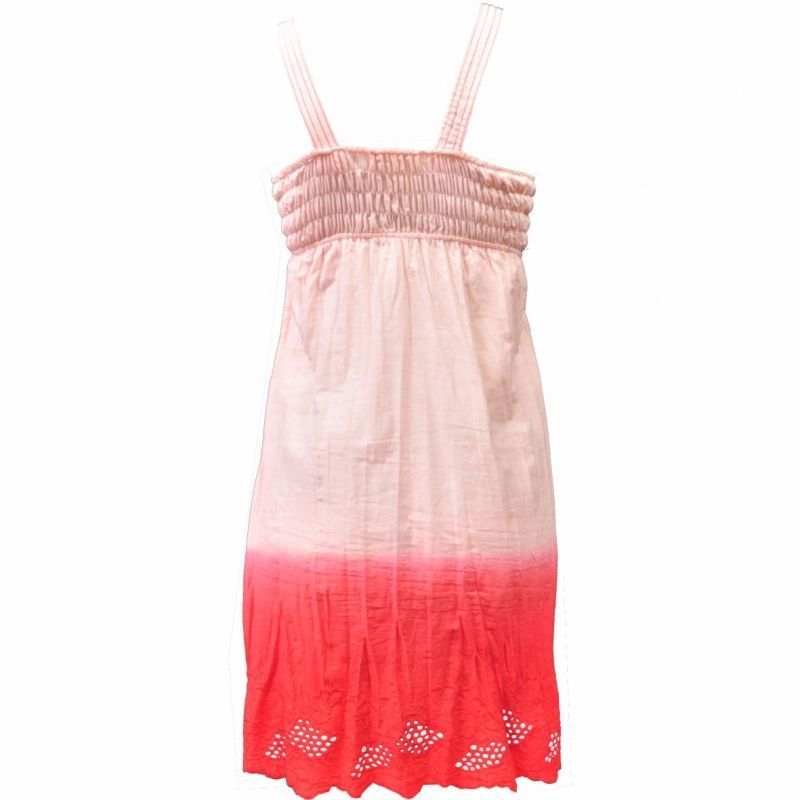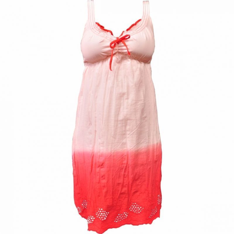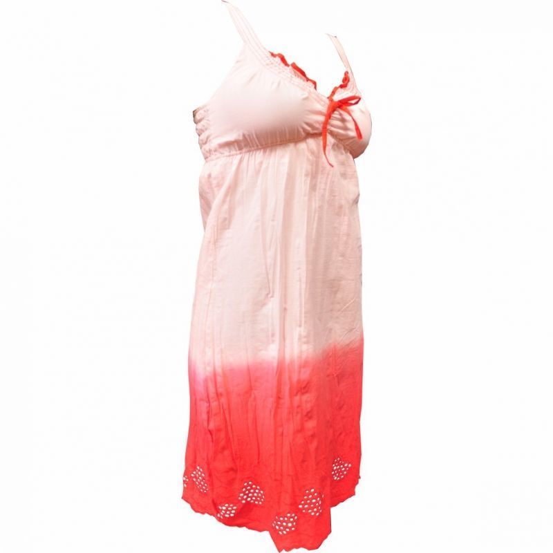 Csinos ,szellős, igazi minőségi, laza szövésű biopamutból készült, térdig érő női ruha. Vidám árnyalatai a pirostól a rózsaszínig terjednek. Alul igényes madeira hímzés, felül állítható széles pánt díszíti.