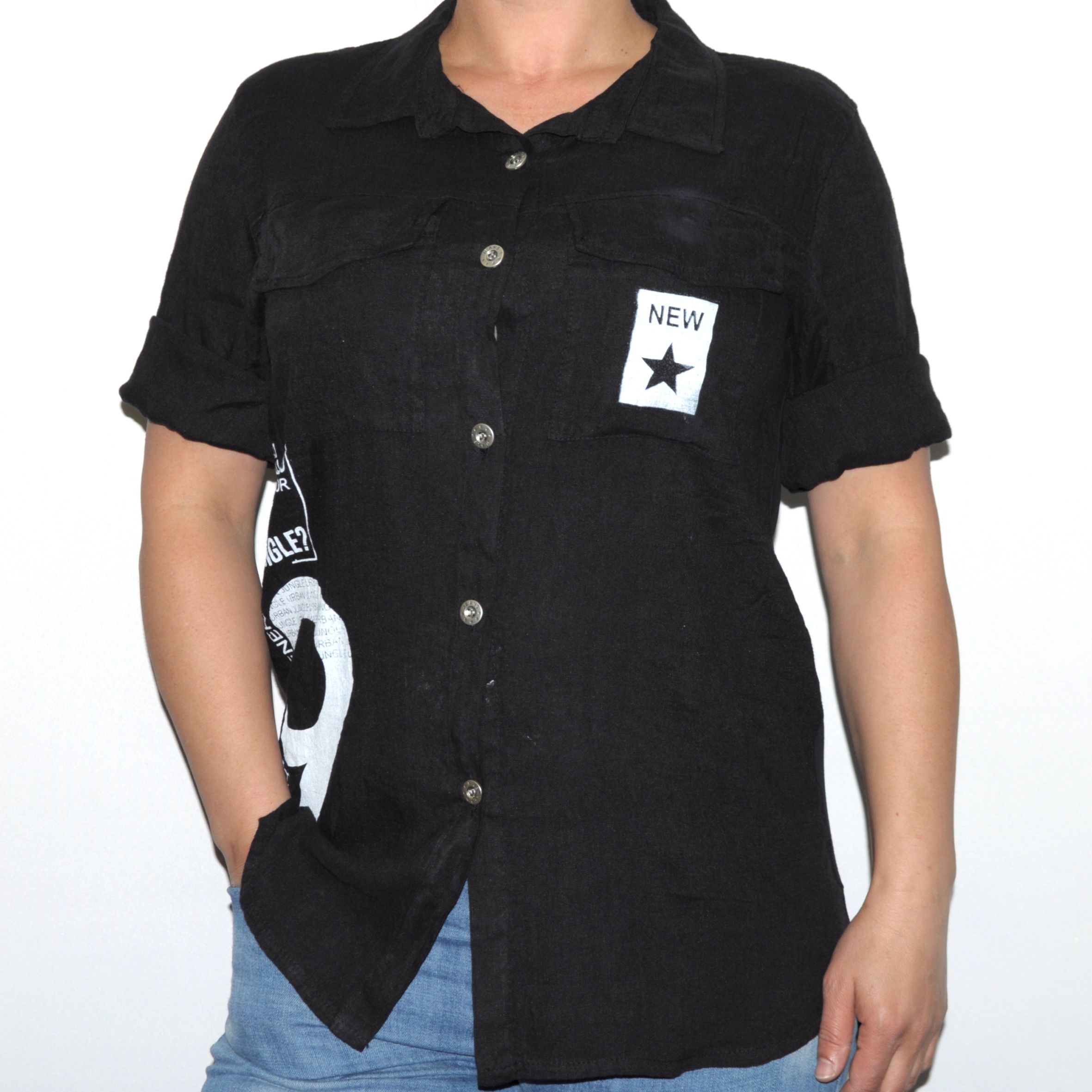 A másik szembetűnő jellemzője az elején található trendi nyomásminták, illetve a fémhatású gombok és a zsebfedővel készült két zsebe.