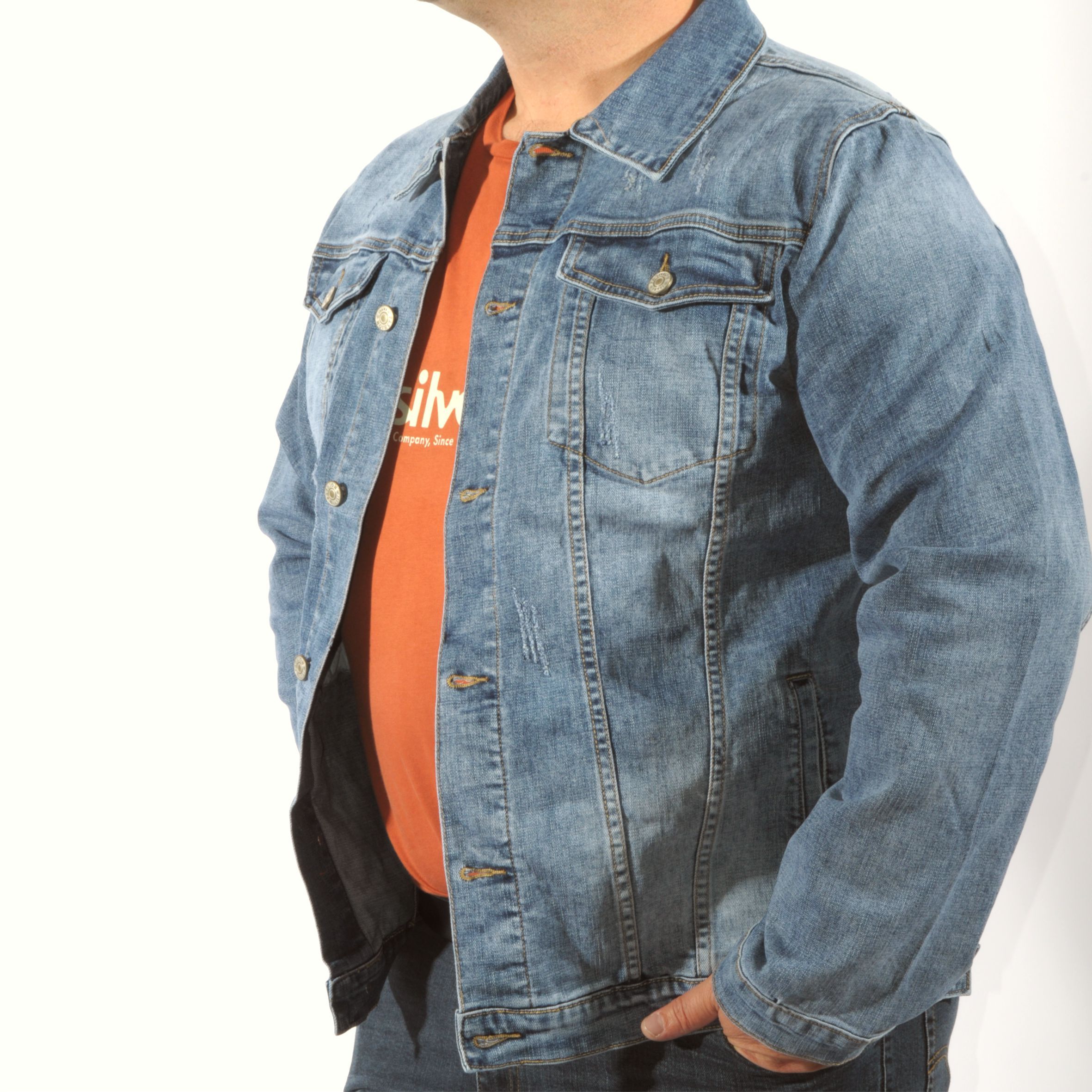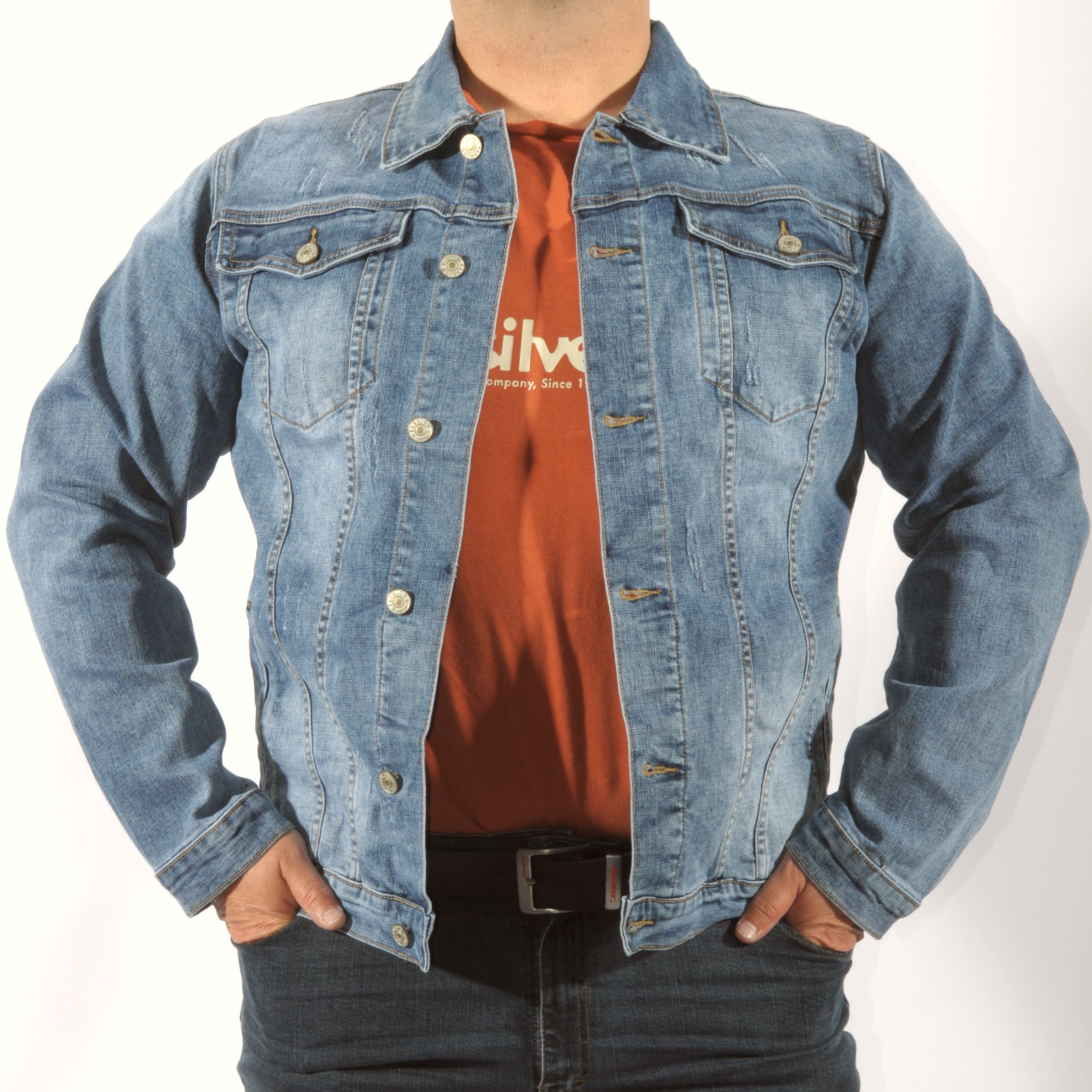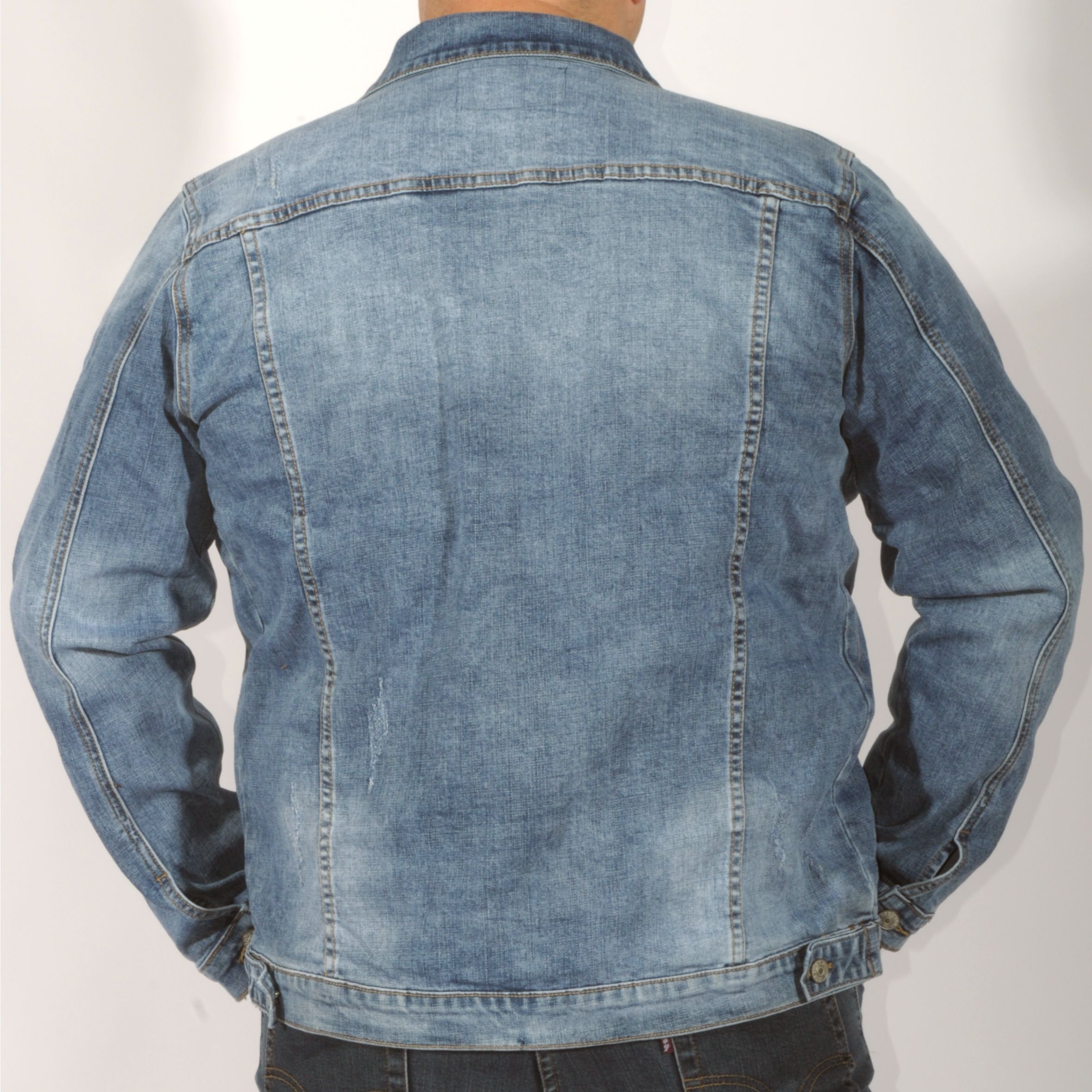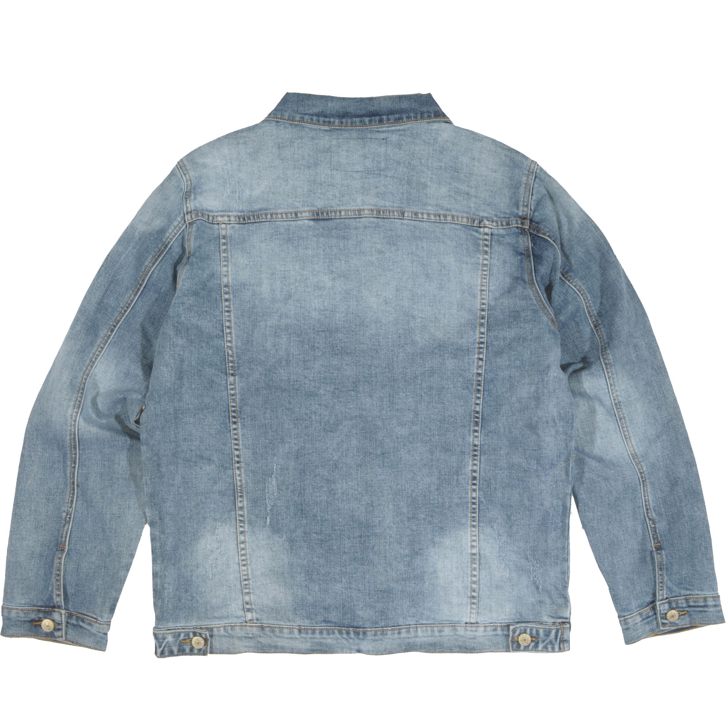 Trendi, szűkített fazonú világoskék színű, elöl és hátul koptatott és kis felületi szaggatásokkal készült uniszex dzseki.