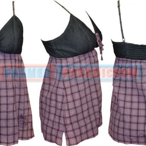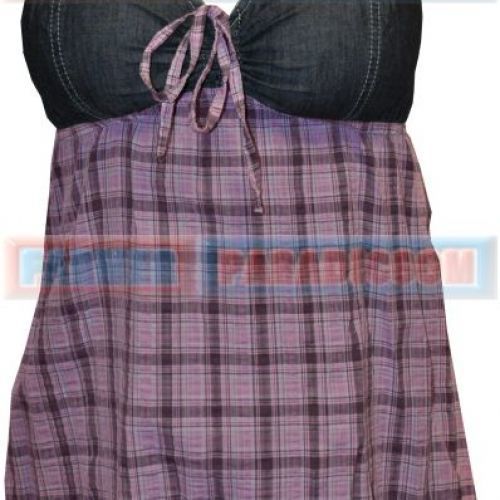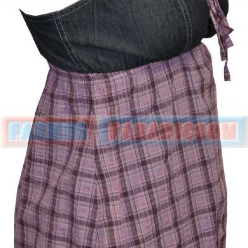Lenge, szellős és szexi. Mellrésze középen összehúzható, hátul gumírozott. Anyaga 100% pamut, felső része farmer, alja kockás vászon. Bal elején márka hímzés két oldalán világosítva.