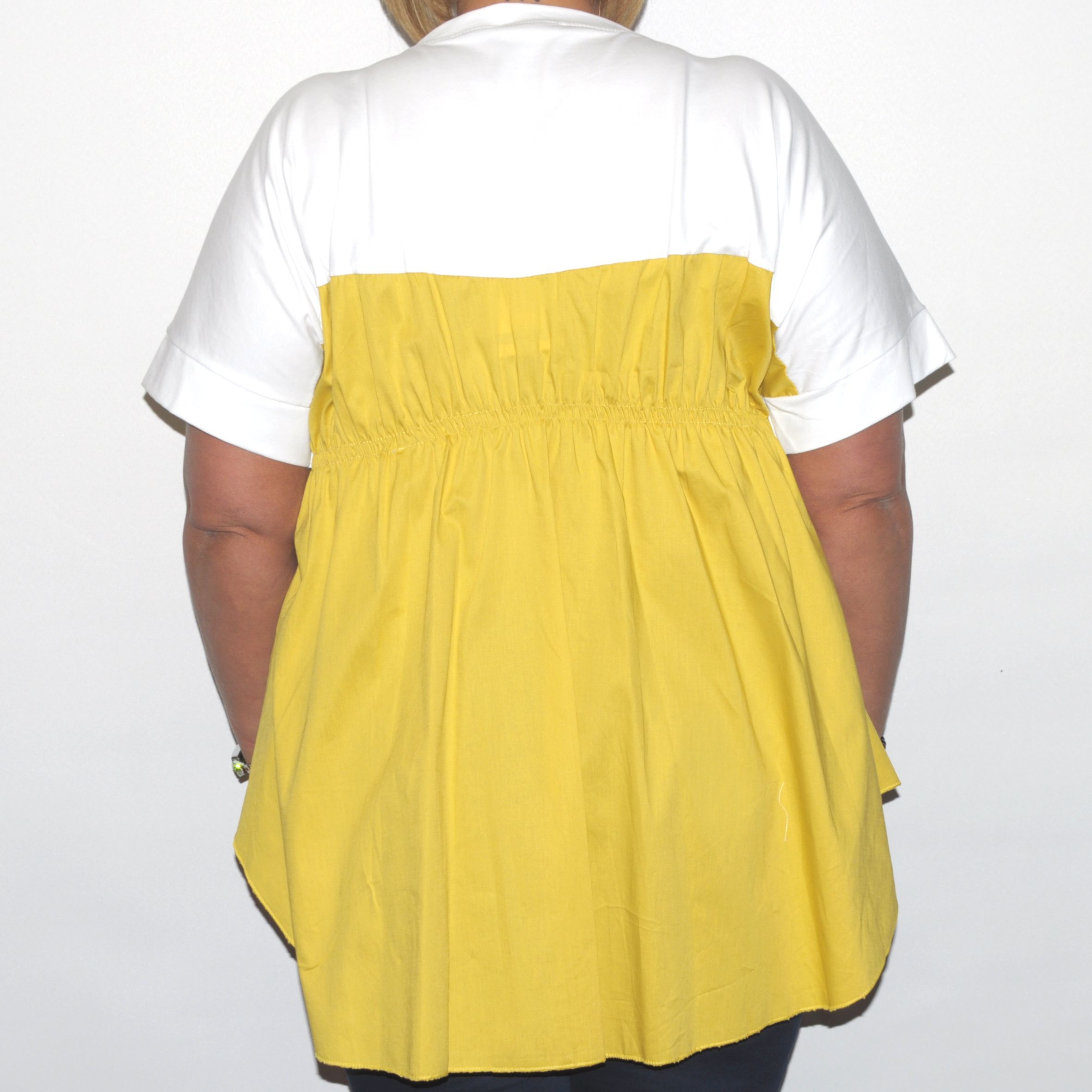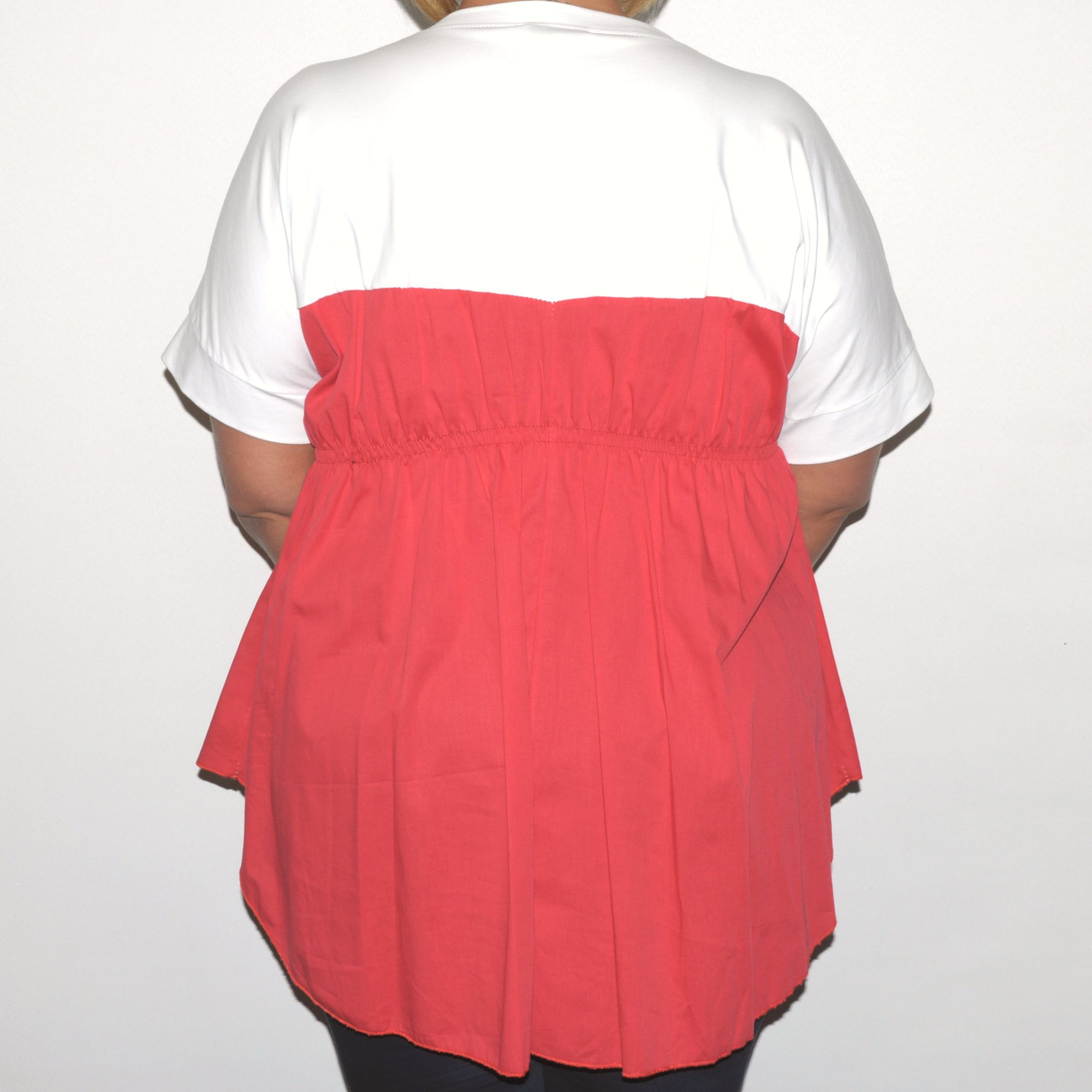 Felső része környakas fehér pólóanyag, alsó része színes sztreccsvászon és az eleje kissé rövidebb a hátuljánál.
