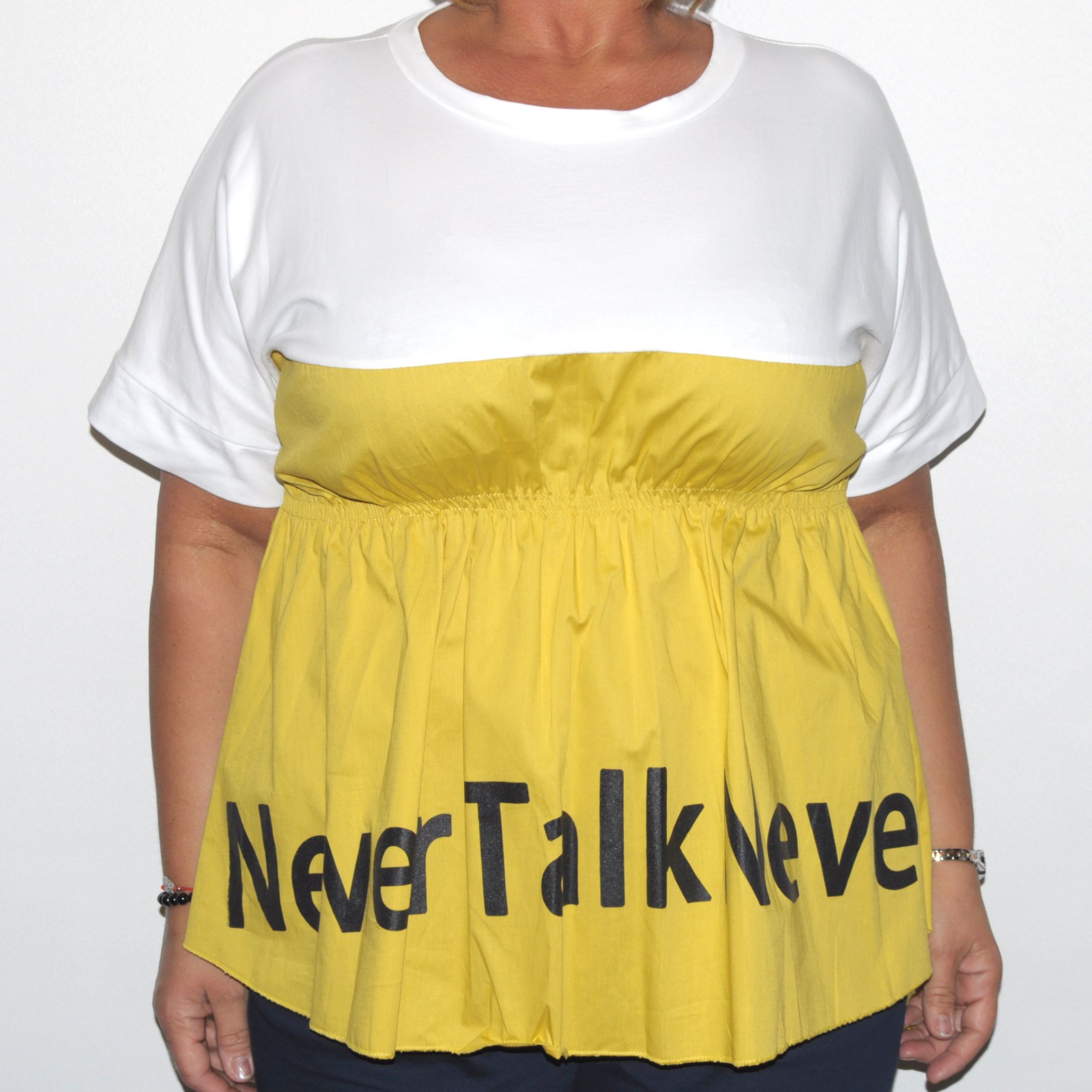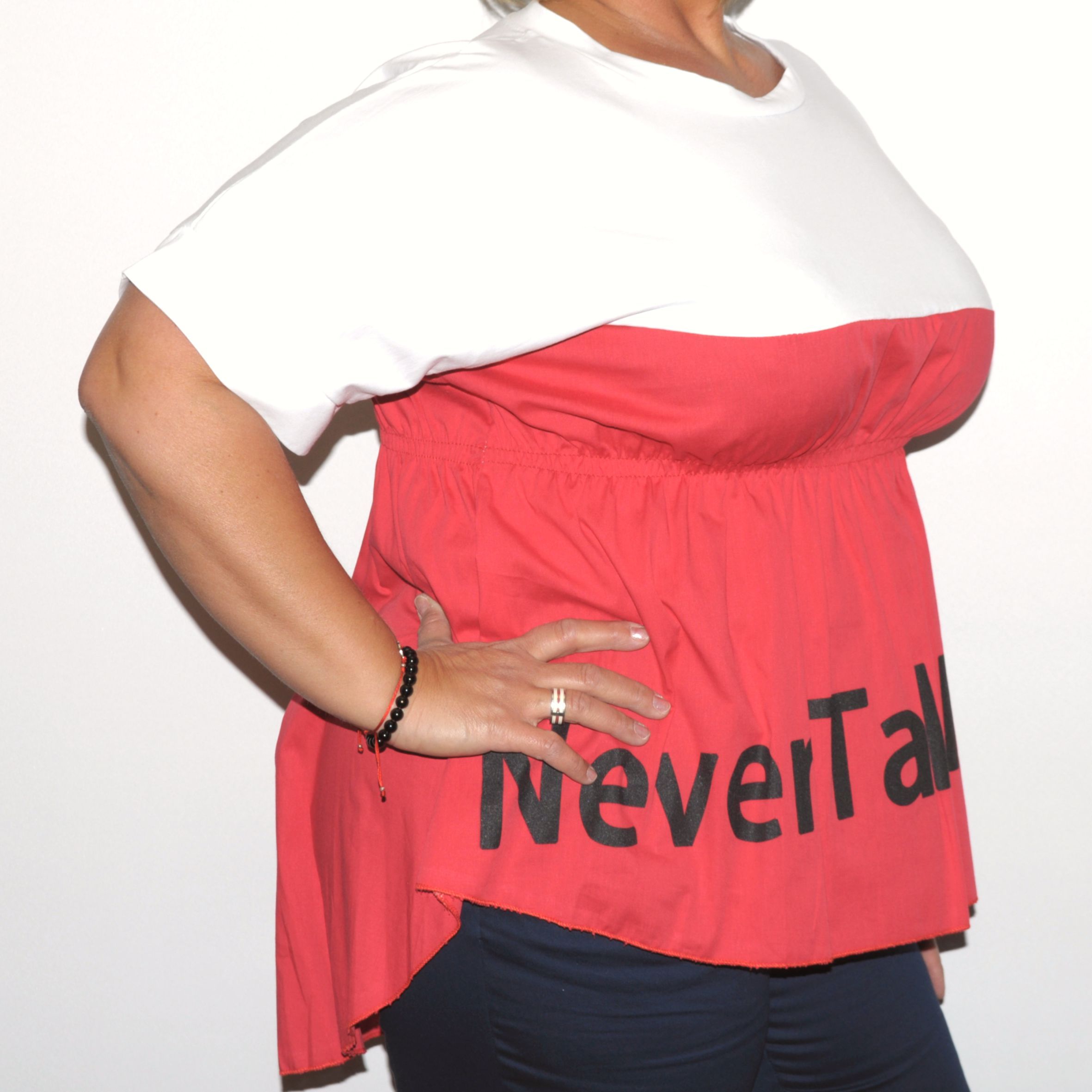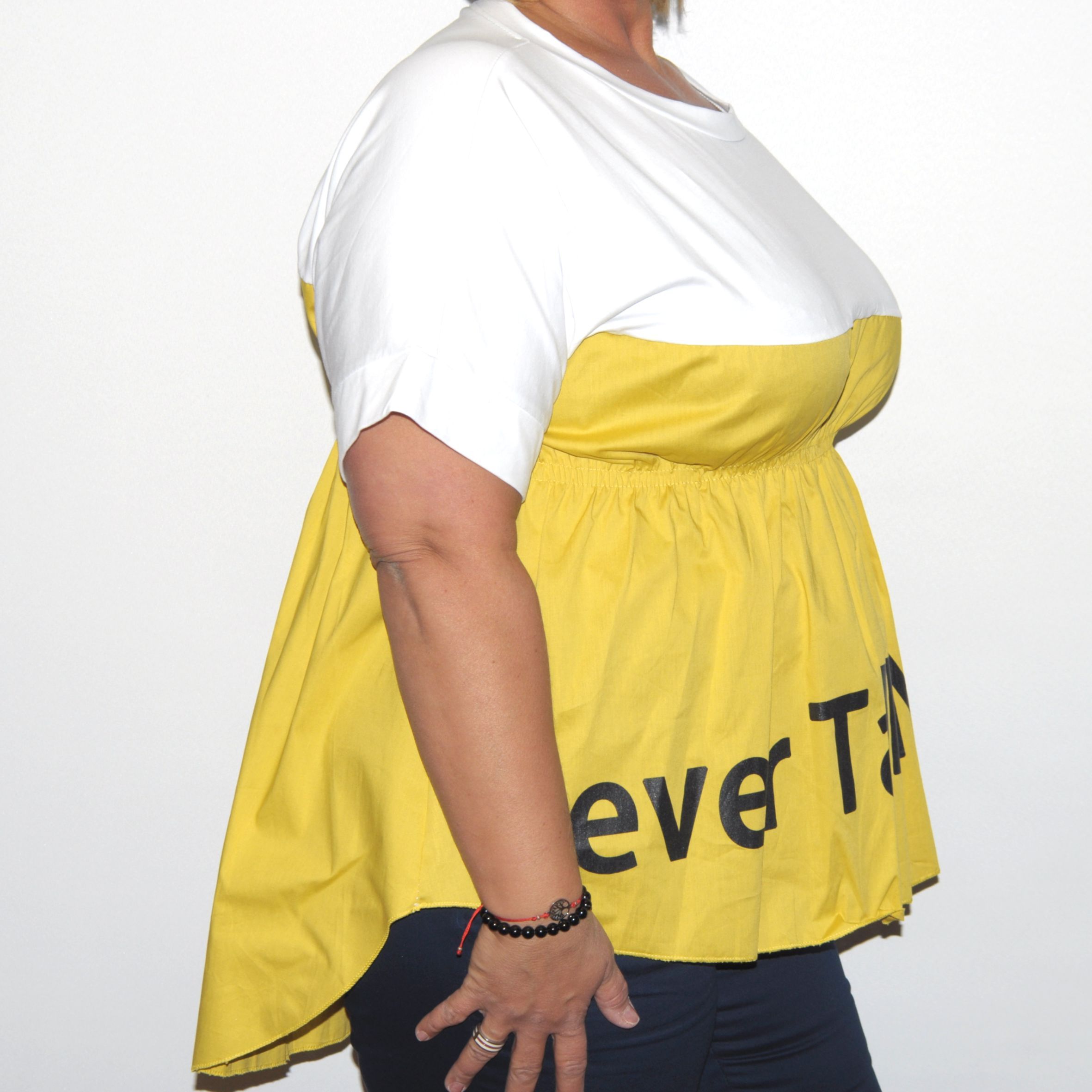 Mell alatt gumírozott, bő fazonú, sztreccspamut alapanyagú női felső.