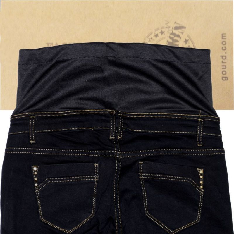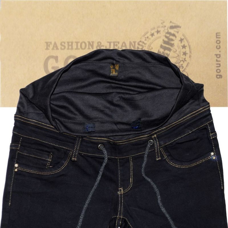 Sötétkék színű, rugalmas, egyenes szárú kismama farmernadrág. Fazonjára jellemző, hogy rövidített csípőrésze pocak alatt kényelmesen elfér. A felső, vastag pamut rész pedig felül állítható, teljes fedést biztosítva körbe a has és a derékrészen. Kevert szálas alapanyaga (78% pamut, 21%PE, 1% elasztán), sztreccses, kívül egyszínű sötétkék, belül fekete. Ötzsebes, drapp tűzéssel, slicc nélküli, belebújós kivitelű kismama csípőnadrág. A képekkel ellentétben a hátsó zsebeken nincsenek strasszok.