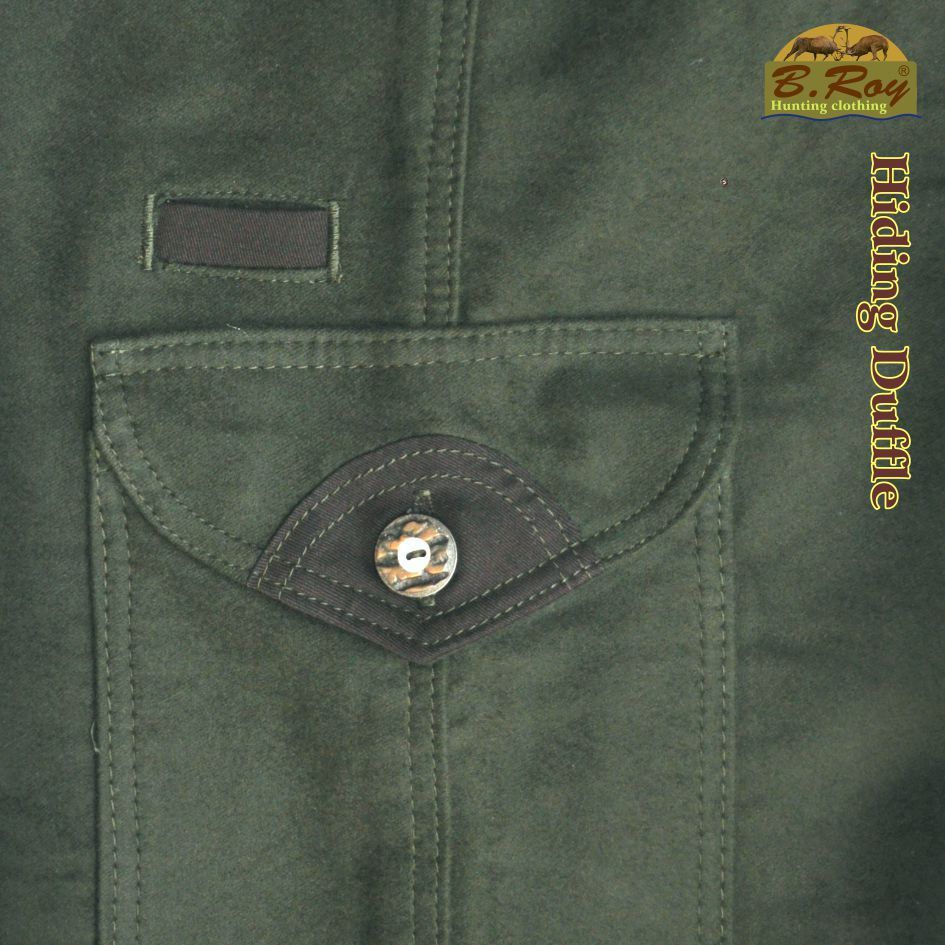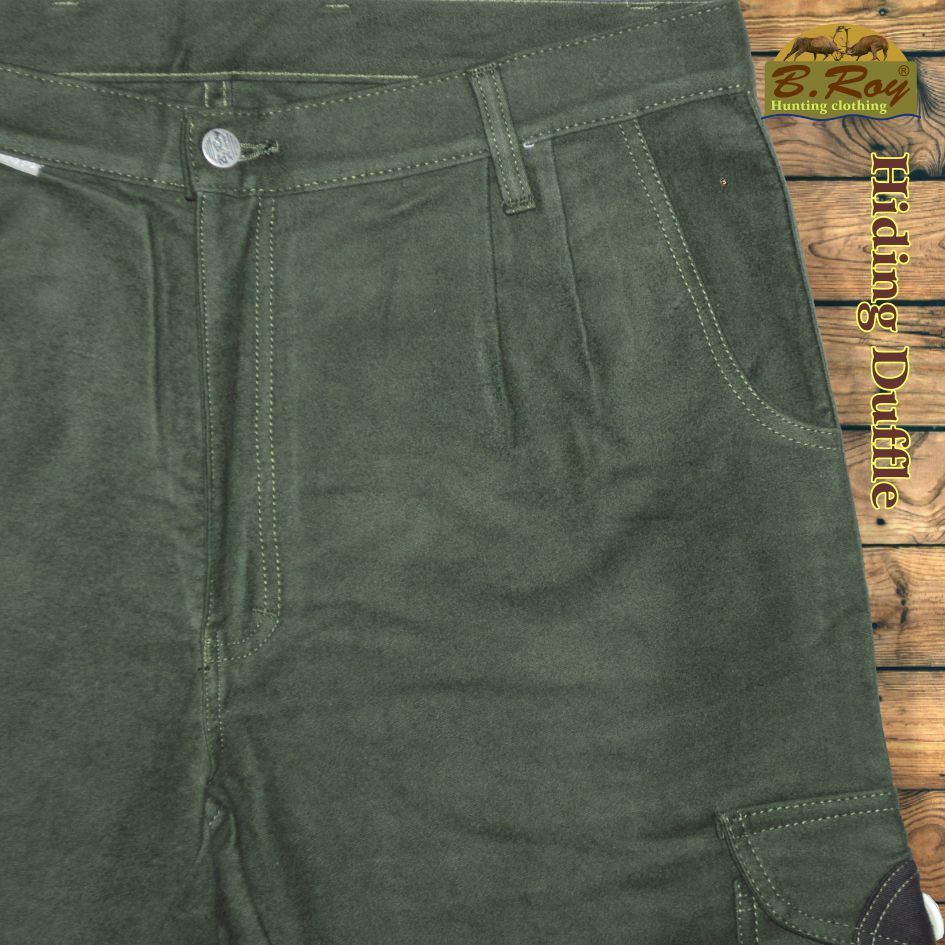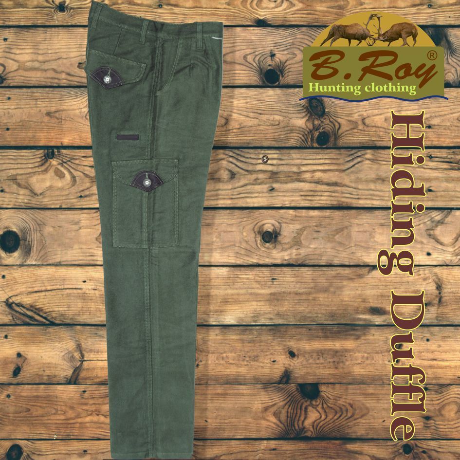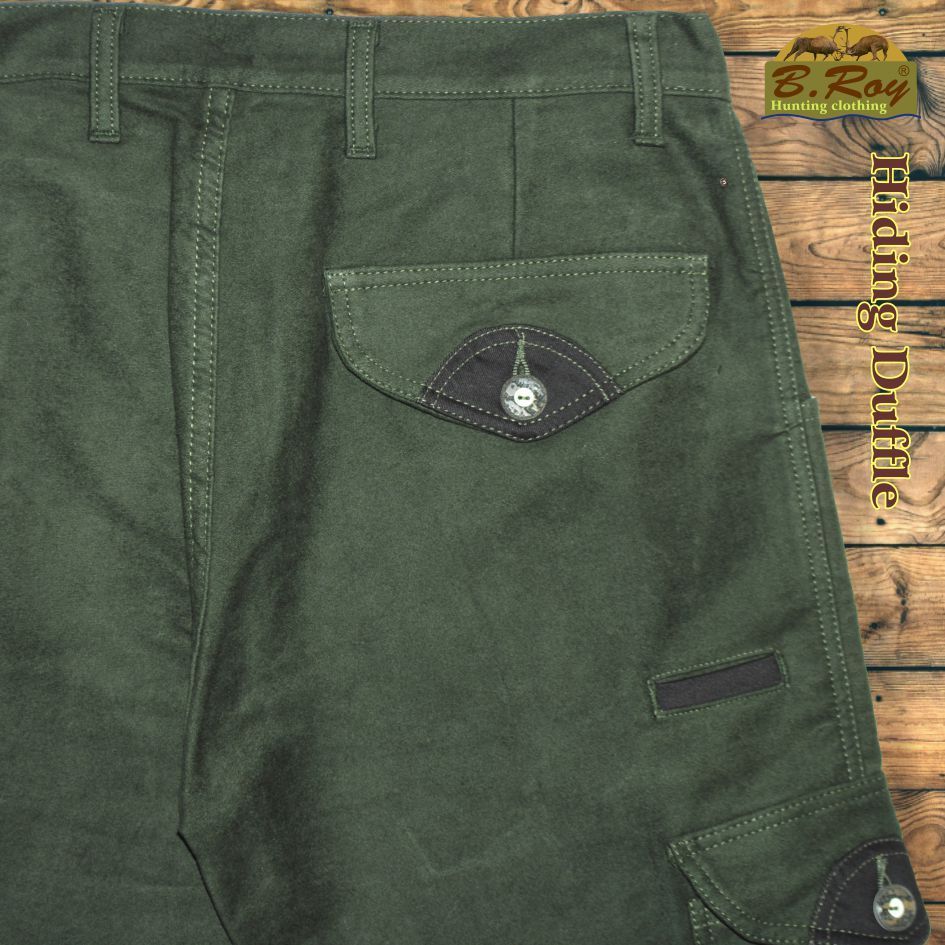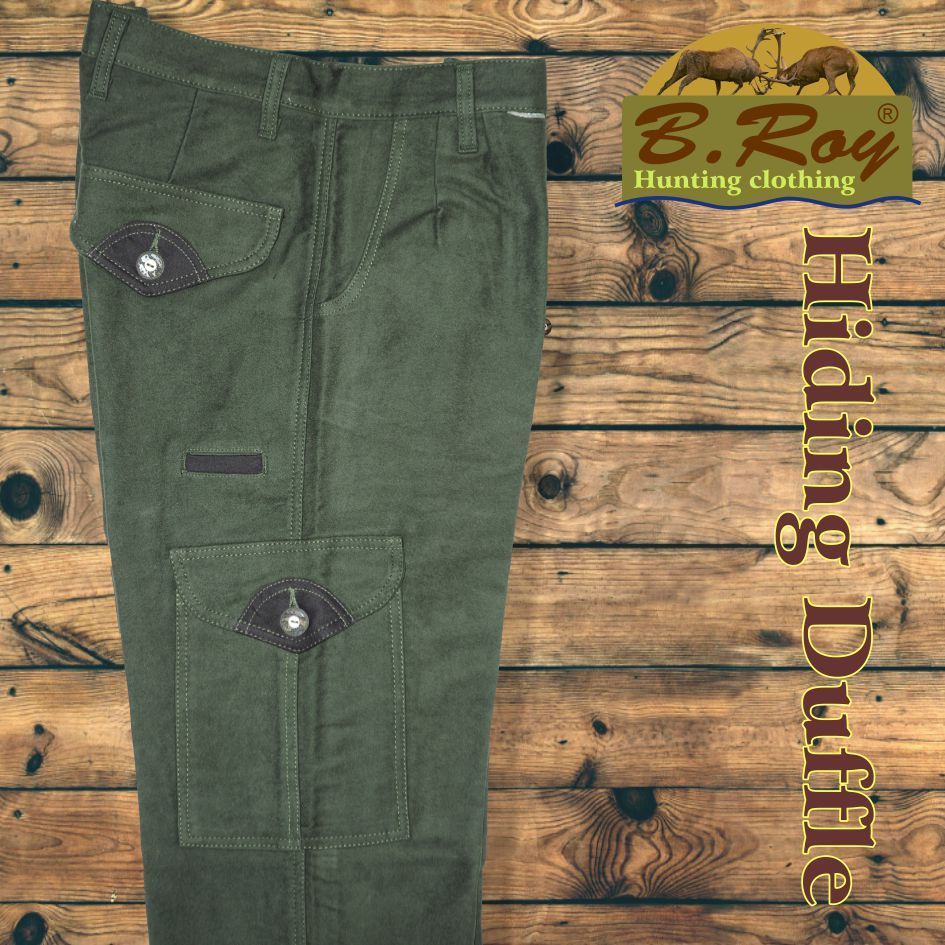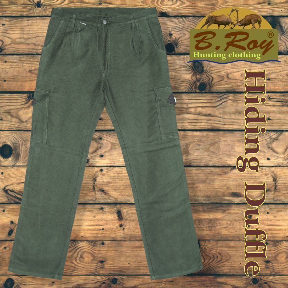 Aki vadászott már düftin alapanyagú (100% pamut) ruházati termékekben, tudja milyen sok pozitív tulajdonsággal rendelkeznek. Könnyű, mégis meleg és szellős. Ezért hasznos társ akár a várakozás óráiban, akár kajtatás közben. Ebből a kellemes anyagból készül a B. Roy Hiding Duffle vadásznadrágja is. Hatzsebes, amelyekből a hátsó és az oldalsók gombbal zárhatóak, elöl fent két svéd-zsebes, jobb combrészén pedig egy tőrzseb teszi teljessé. Enyhén emelt derékrésze (szűkítésekkel) és bővített combrésze kényelmes mozgást biztosít. Övbújtatója dupla, így vékonyabb vagy vastagabb övvel (4 cm-ig) is komfortosan használható. Gombos, cipzáros záródású.