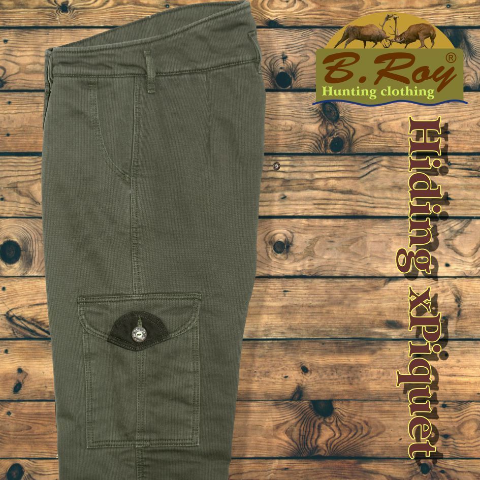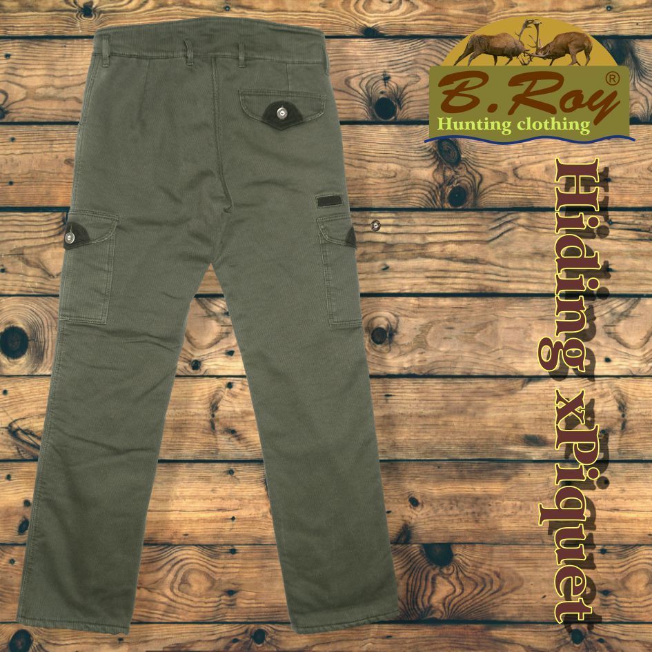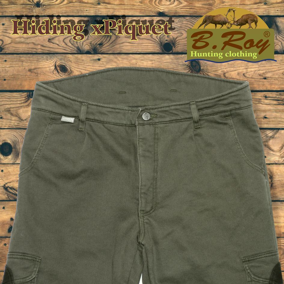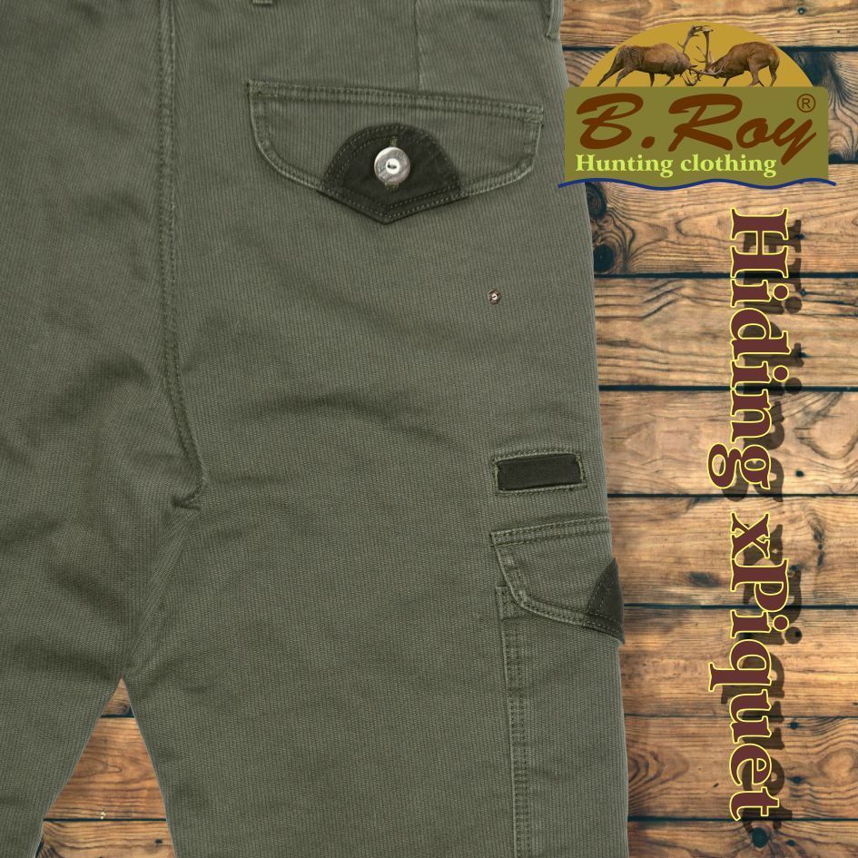 A téli vadászatok nélkülözhetetlen kelléke a B. Roy márka Hiding xPiquet bélelt oldalzsebes vadásznadrágja. Két külön álló réteg biztosítja a megfelelő hőszigetelést. A külső része, egy Piké elnevezésű, bordás szövésű (ismerhetik farmerkordként is) prémium alapanyag, amely 100% pamut összetételű. Sprőd felülete jól bírja bozótos terepen történő haladást. A belső, bolyhozott felületű thermo béléssel együtt biztosítják a tökéletes hőtartást. A hátsó derékrésznél extra magasított zóna felel a belső szervek melegen tartásáról. Ötzsebes, amelyekből az elsők svéd-zsebes kivitelűek, az oldalán és a hátsó részén lévők zsebfedővel készültek, díszgombbal zárhatóak. Tűzésének színe megegyezik az alapanyagáéval. Gomb-cipzár záródású.