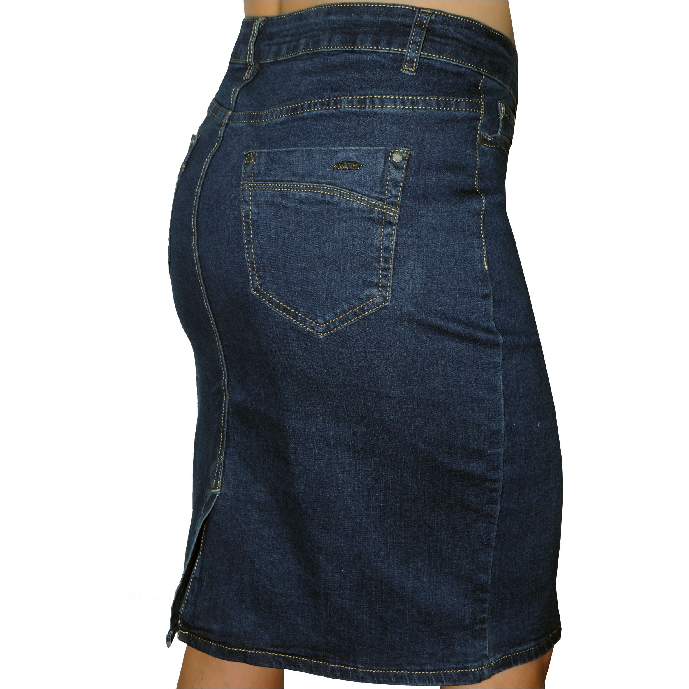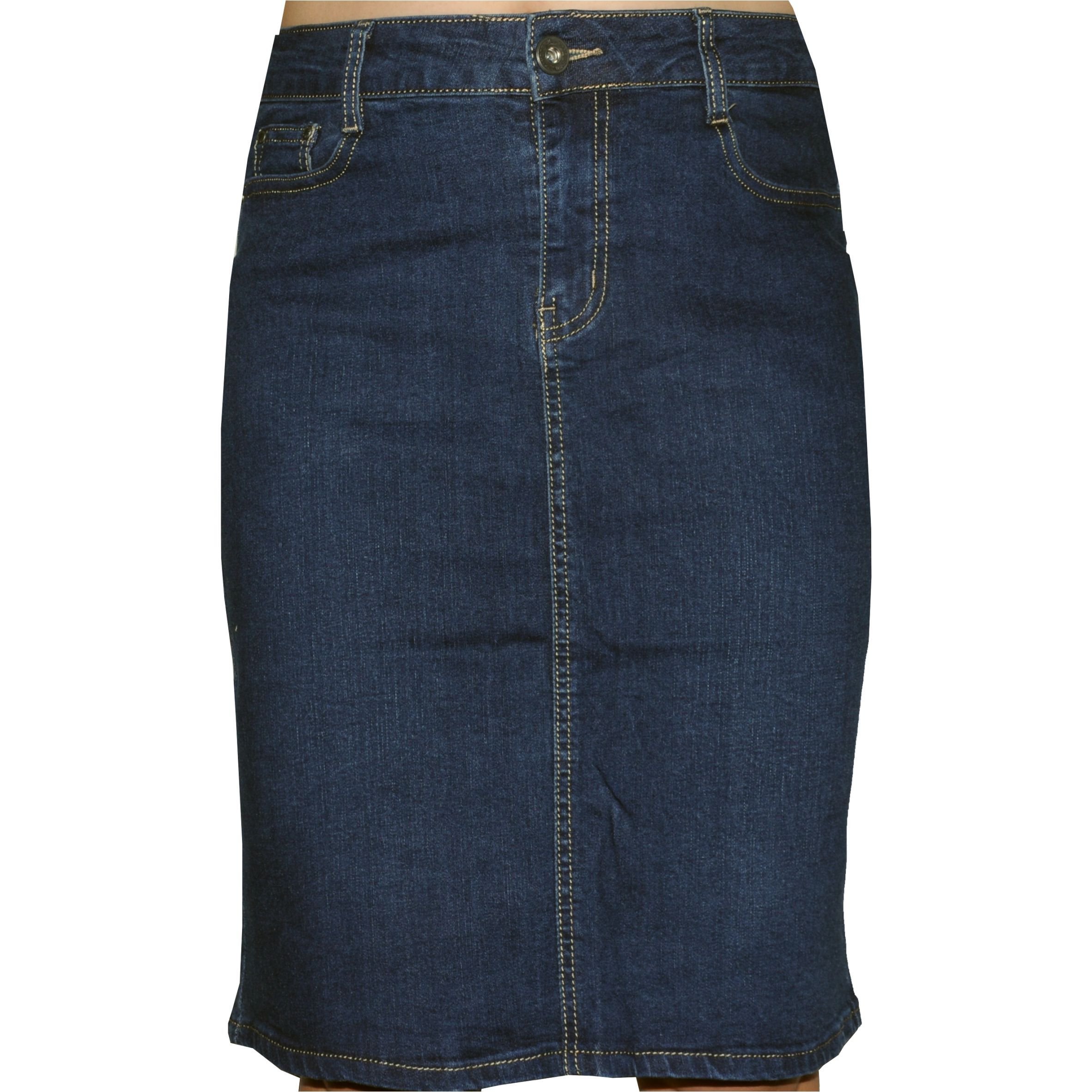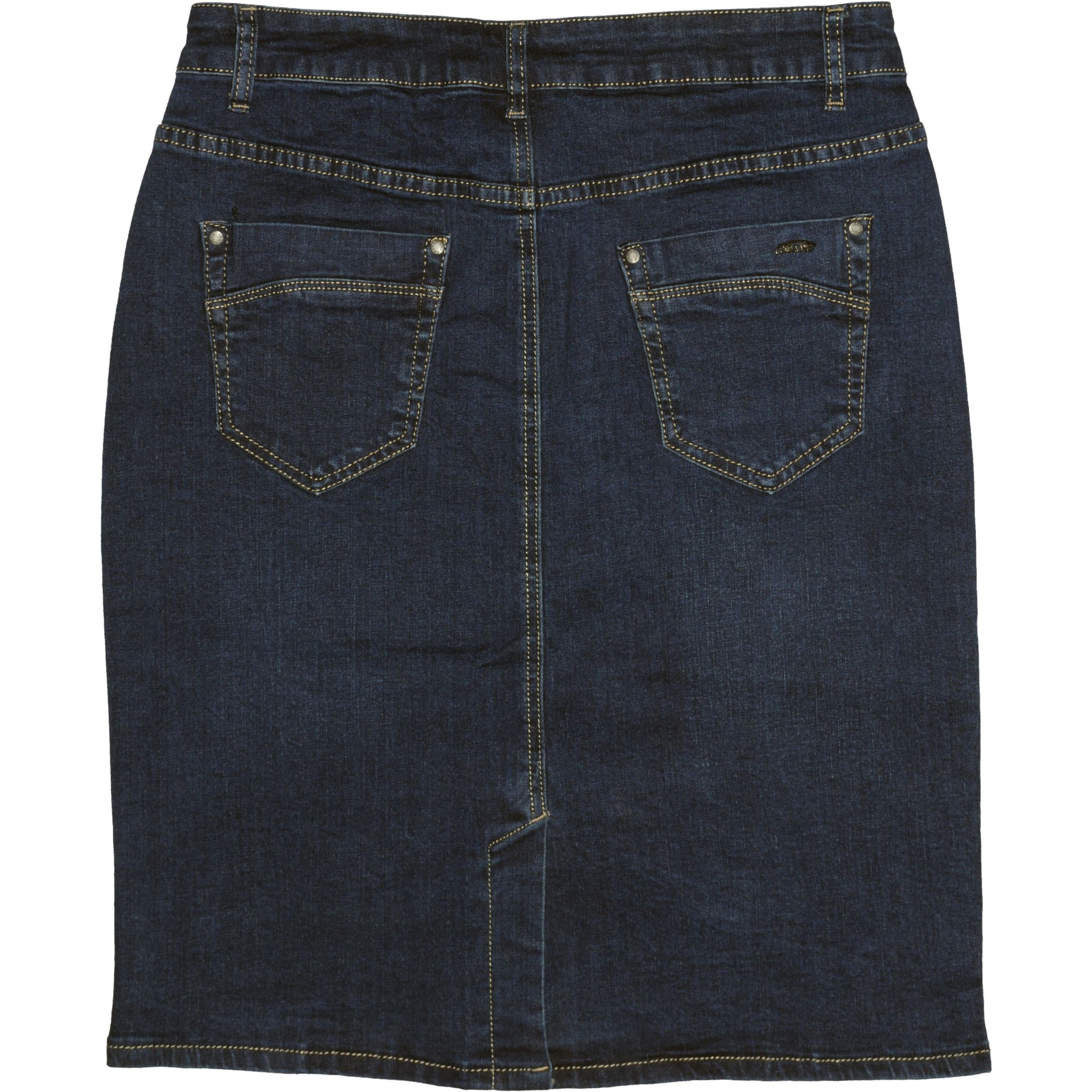 Sötétkék, általában kicsivel térd alá érő klasszikus fazonú farmerszoknya. Kevert szálas, szálkoptatott szövésű, rugalmas alapanyaga és sárgás-drapp tűzései tovább erősítik a hagyományos farmer stílust - egy kis trendi utóérzéssel. Tökéletes választás hétköznapi viseletként, vagy akár alkalmi megjelenéshez is. Öt, szegecsekkel erősített zsebei praktikusan használhatóak.